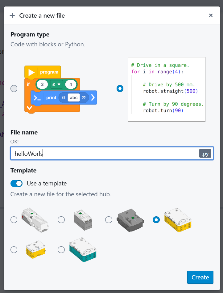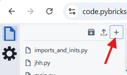 Перед тем как писать код, нужно создать новый файл в редакторе Pybricks.