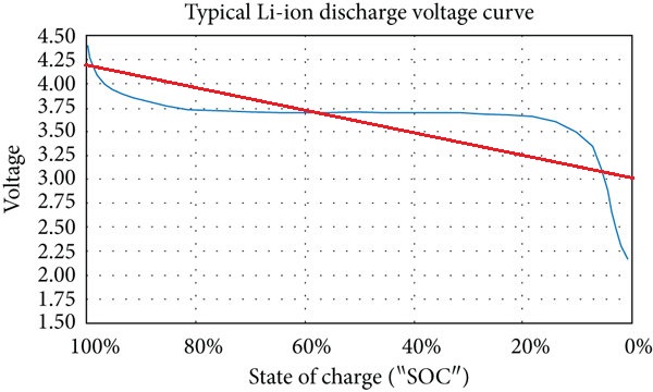 На графике ниже показано, как напряжение литий-ионного аккумулятора падает по мере разряда (синяя линия - реальное значение, красная линия - как показывает код). Обратите внимание, что падение не линейно.